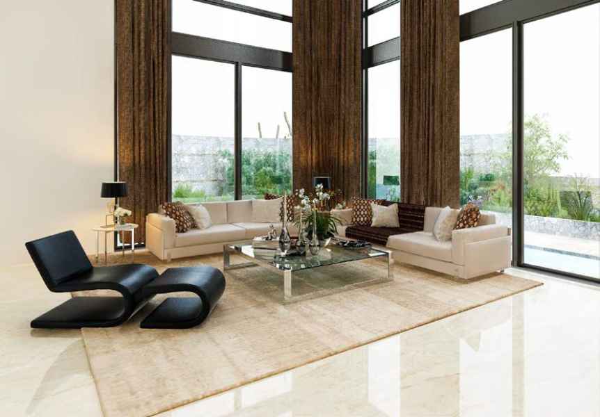 Für Bodenflächen in Wohnbereichen bieten sich hochwertige Feinsteinzeug – Fliesen in vielen Varianten an. In teilpolierter oder hochglänzend polierter Oberfläche vermittelt dieses Material einen edlen Charakter bei gleichzeitiger Strapazierfähigkeit.